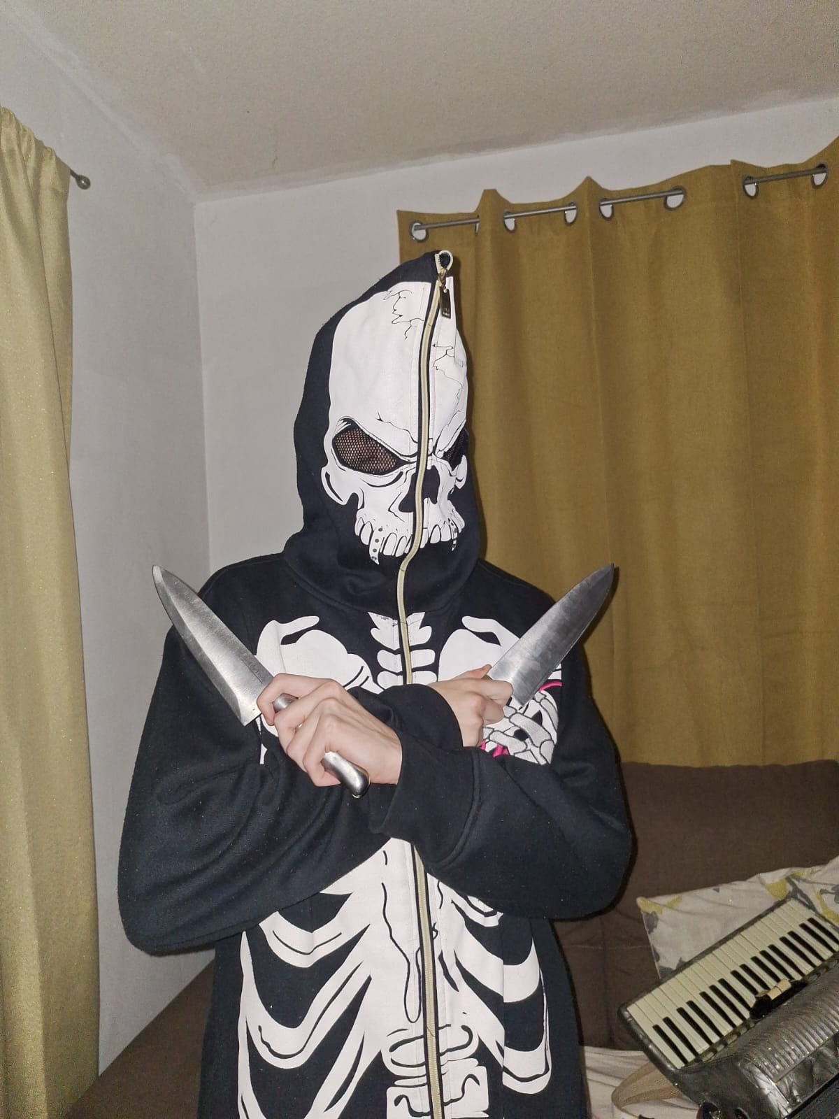 Una persona está de pie en el centro de la imagen vistiendo una sudadera negra con capucha que se cierra completamente mediante una cremallera vertical que recorre desde el torso hasta la cima de la cabeza, ocultando el rostro por completo. La tela de la capucha tiene impreso el diseño de un cráneo blanco agresivo con mandíbula y dientes, y cuenta con orificios de malla negra a la altura de los ojos. En el torso de la sudadera continúa el estampado con una caja torácica y huesos de la cadera en blanco. El sujeto mantiene los brazos cruzados sobre el pecho en forma de equis, sosteniendo un cuchillo de cocina grande en cada mano. Las hojas de los cuchillos son metálicas, plateadas y puntiagudas, orientadas hacia arriba y hacia afuera en ángulo. Se aprecian las manos de piel clara sujetando firmemente los mangos de los utensilios.