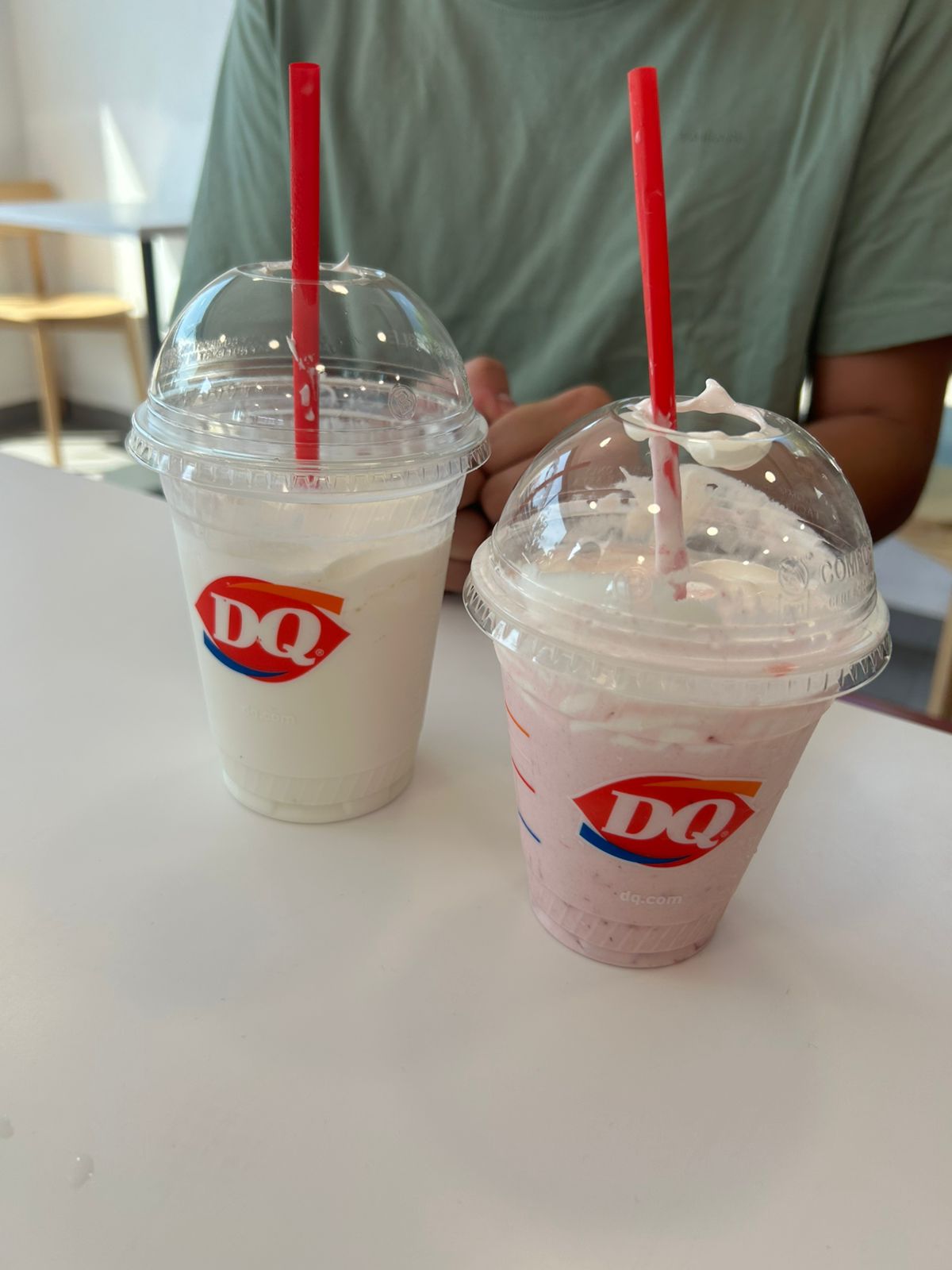 El vaso de la izquierda contiene un batido de color blanco cremoso. En el centro del vaso hay un logotipo rojo y naranja que dice "DQ". Debajo del logotipo, en letras pequeñas, se lee "dq.com". Una pajita roja sobresale de la parte superior del vaso, insertada a través de un orificio en la tapa.