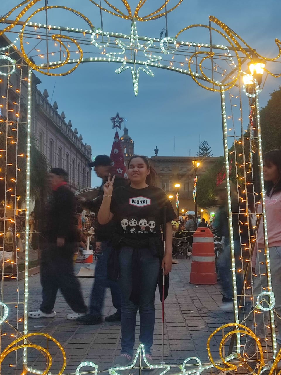 Domingo, 07/12/2025 17:15:53Fotografía de una joven en un espacio público al aire libre, probablemente el centro histórico de una ciudad durante época navideña. La imagen está tomada al atardecer o anochecer, ya que el cielo es de un azul claro y las luces decorativas ya están encendidas.