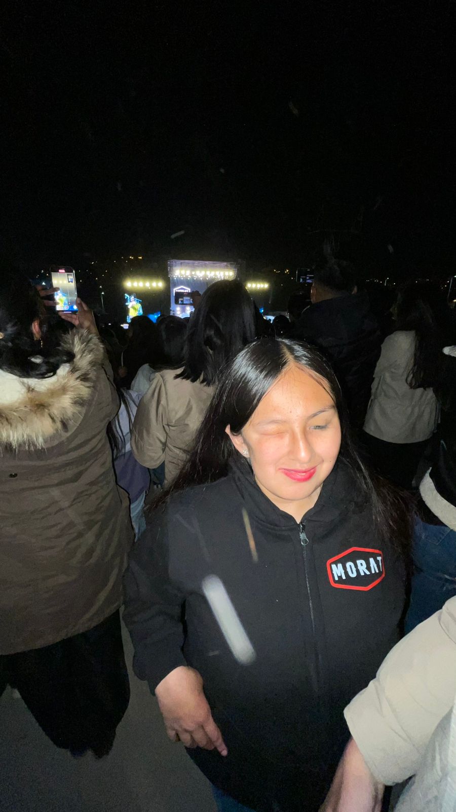 Tiene el cabello largo y lacio, de color oscuro, y luce una sudadera negra con cierre, que destaca por un logo grande al lado izquierdo del pecho con la palabra “MORAT” en letras blancas dentro de un borde rojo, lo que indica que probablemente es fan de la banda que está tocando en el escenario al fondo. Su postura relajada y la sonrisa en su rostro reflejan alegría y disfrute, pareciendo completamente inmersa en la experiencia del concierto.
