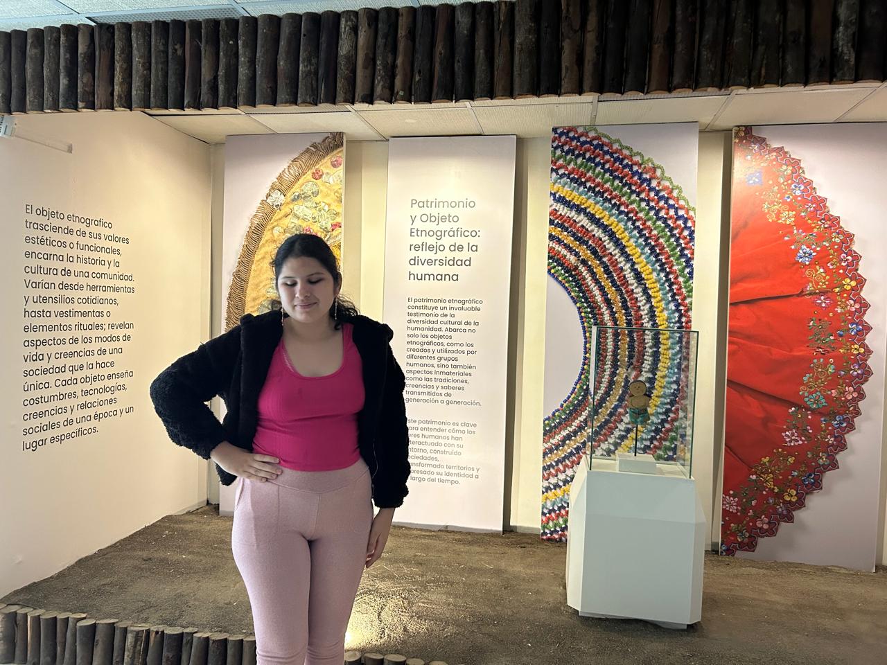 Detrás de la joven, se extiende un muro con paneles de exposición. En la parte superior, una estructura de techo con troncos de madera visibles.