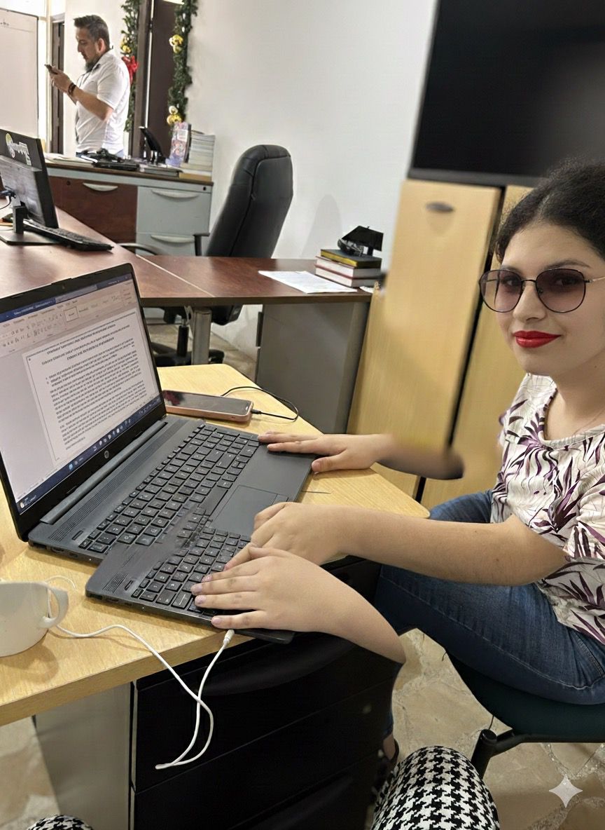 En primer plano, se ve a una mujer joven de complexión delgada a mediana, sentada en una silla de oficina con respaldo negro y asiento verde oscuro. Está ligeramente girada hacia su derecha, mirando directamente a la cámara con una expresión sonriente y relajada. Su cabello oscuro está recogido, con algunos mechones sueltos enmarcando su rostro. Lleva unas gafas de sol redondas con montura metálica delgada en tono dorado y lentes de color oscuro que tienen un ligero degradado ahumado, con un matiz púrpura en la parte superior. Sus labios están pintados con un vibrante lápiz labial rojo, y sus cejas son oscuras y bien definidas. La piel de su rostro es clara, con mejillas ligeramente rosadas. Viste una blusa de manga corta con un estampado de hojas o motivos florales en tonos morados, verdes y grises sobre un fondo blanco. Lleva jeans ajustados de color azul. Parte de su pierna izquierda está cruzada sobre la derecha, y debajo del escritorio se asoma una parte de su pantalón con un patrón de pata de gallo en blanco y negro. Sus manos, de dedos finos, están posicionadas sobre el teclado de una computadora portátil de color gris oscuro, aparentemente escribiendo o preparándose para hacerlo.